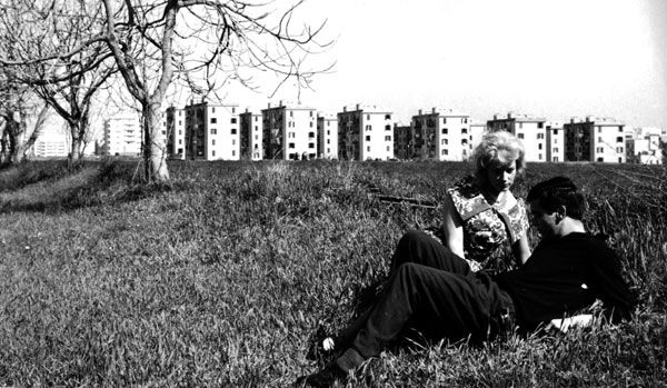 Pour ne pas rester dans une chambre vide, avec une armoire aux portes ouvertes avec des cintres qui pendaient et cliquetaient, je sortis de l’hôtel et attendis un bus Piazza Vescavio. Longtemps, à l’arrêt du bus j’observais des paquets de moucherons qui formaient des nuées sous les lampadaires. Je montai dans un bus vide qui traversa le Tibre par un pont de fer. Je découvris, posée sur une eau d’un vert plomb une sorte de bâtisse en planches, arrimée au quai par des filins et je me souvins que dans ma jeunesse en Bretagne j’avais pris des cours d’aviron de mer . Plus loin s’étendait une zone déserte, herbeuse, entourée de grillage. Enfin le bus s’arrêta dans une sorte de gare interurbaine avec des bus bien alignés, éteints. C’était le terminus. Je descendis. Il y avait des groupes d’hommes silencieux qui fumaient et attendaient. Ils avaient tous des tenues de chantier , certains portaient des gamelles ou des sacs à dos. Ils me fixèrent ou plutôt fixèrent surpris et désapprobateurs ma veste de lin et ma chemisette rouge bien repassée . Il me semblait déjà avoir vécu cette scène dans une autre vie. Je m’éloignai le long de la chaussée. Plus loin des routes à l’abandon s’achevaient en buissons et en lignes d’herbe sèche. Il y avait des piliers de béton, solitaires, avec des affichettes électorales pour le Parti communiste toutes déchirées,ou tagguées ou pâlies à cause des intempéries.