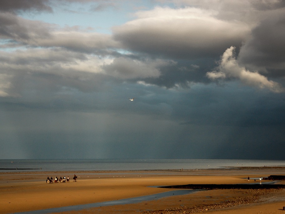 …De nouveau sur la plage de Langrune, devant la route noire mon enfance ne passe pas. Sales souvenirs de pension restés entrouverts.. Mes parents sont des jeunes gens qui ne m’ont pas encore conçu. Au large, les catamarans culbutent les vagues. Plus d’ombre, une coulée lumineuse vers Riva-Bella . Gigue de mâts, fenêtres qui cognent, minuscules rides d’argent qui ourlent la plage. Pendant la nuit, des paquets d’algues ont bruni les bancs de sable. Tu es là, proche, enfance, cette honte qui te colle au corps,baguettes des jambes, crabe tricoté large sur ta misère laineuse qu’on appelle un maillot de bain . Tu échanges le froid de la mer avec ton propre froid.A 43 ans de distance tu cherches une délivrance impossible dans les traces de sel qui suintent sur les poteaux de bois goudronneux .