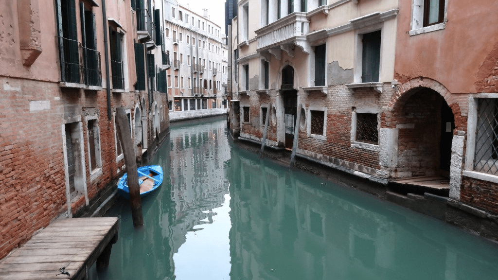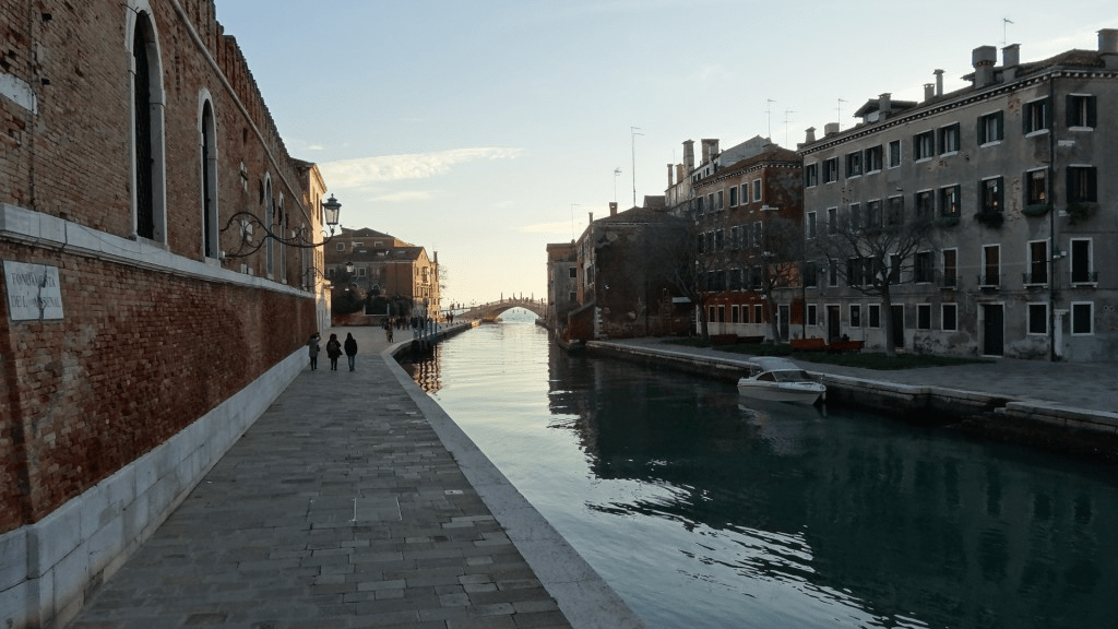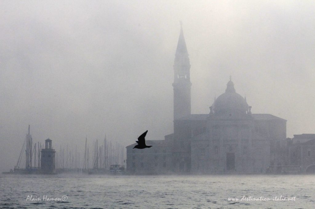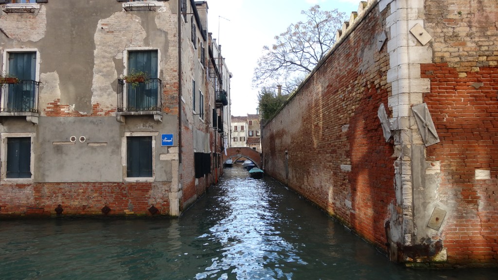 Journées d’hiver et de brume : quais à la lumière rasante , matinées ouateuses et brouillées, tombées de nuit brutales qui transforment les étroits canaux en coupe gorge, aux lumières incertaines ; on avance dans un labyrinthe inquiétant, envahi d’eau presque immobile aux remous gras et funèbres comme si une inondation insidieuse était en train de s ‘étendre entre palais, courettes, hospices, cloitres, casa ceci casa cela, ou demeures vides aux ornements gothiques en train de se délabrer. Toutes ces lentes ondulations noires en train de clapoter le long de portails de bois en train de moisir font penser à une agonie architecturale au ralenti.