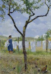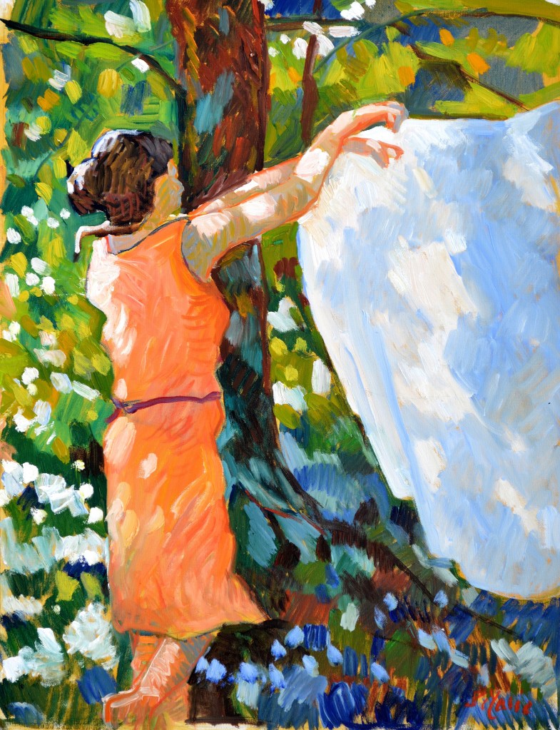 Les matinées de grande lessive naissait alors dans le jardin une procession éclatante d’étendards craquelés sur fonds d’herbes d’un vert cru. Les draps ondulaient et parfois se gonflaient sous la brise. Le rideau de bouleaux frémissait argenté. . Le verger lui même prenait une profondeur de neige printanière suspendue.Je voyais derrière les branches une génération ancestrale heureuse et à table dans des costumes blancs, en train de lever de minuscules verres du trou normand.