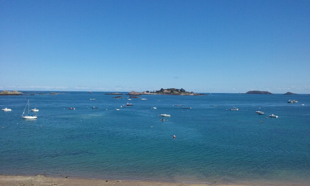 Quittant cette pièce assez sombre pour la terrasse ,choc lumineux, réverbération, le vent claque, et au-delà de la frêle balustrade ,la baie étincelante, le ciel bleu.