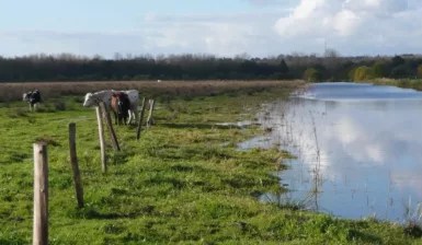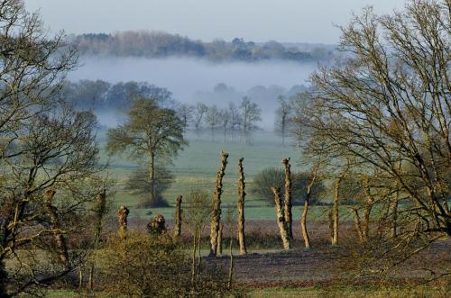 Enfin, vers dix heures et demi les haies et les chênes du bocage émergent . La ligne de bouleaux offre son frémissement argenté. Je monte dans la 204 et prends le sentier à travers les prairies.